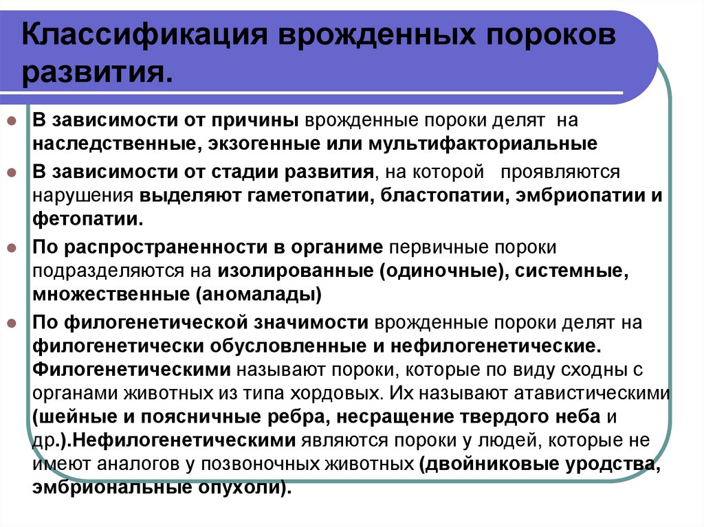 В зависимости от причины врожденные пороки делят нанаследственные, экзогенные или мультифакториальные