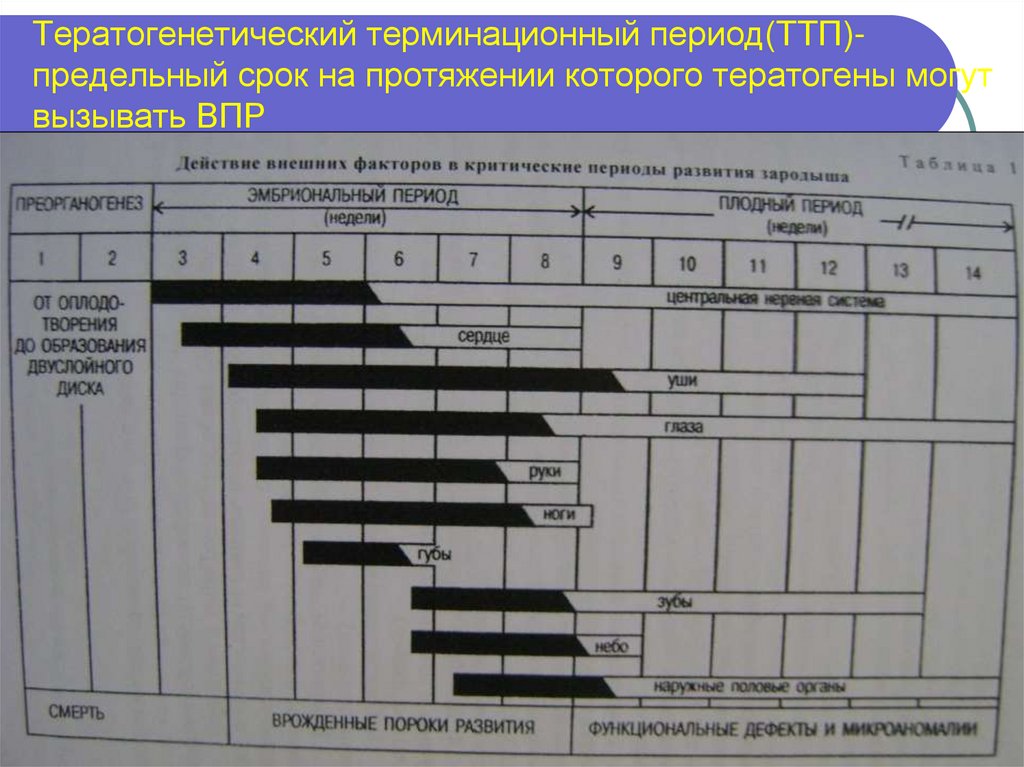 Тератогенетический терминационный период(ТТП)предельный срок на протяжении которого тератогены могутвызывать ВПР