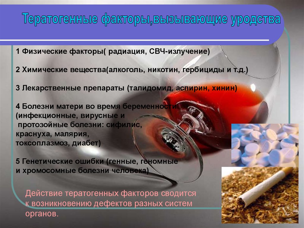 1 Физические факторы( радиация, СВЧ-излучение)2 Химические вещества(алкоголь, никотин, гербициды и т.д.)