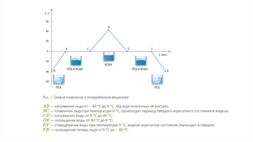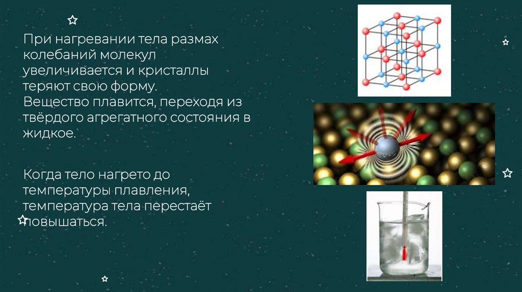 7. При нагревании тела размах колебаний молекул увеличивается и кристаллы теряют свою форму. Вещество плавится, переходя из