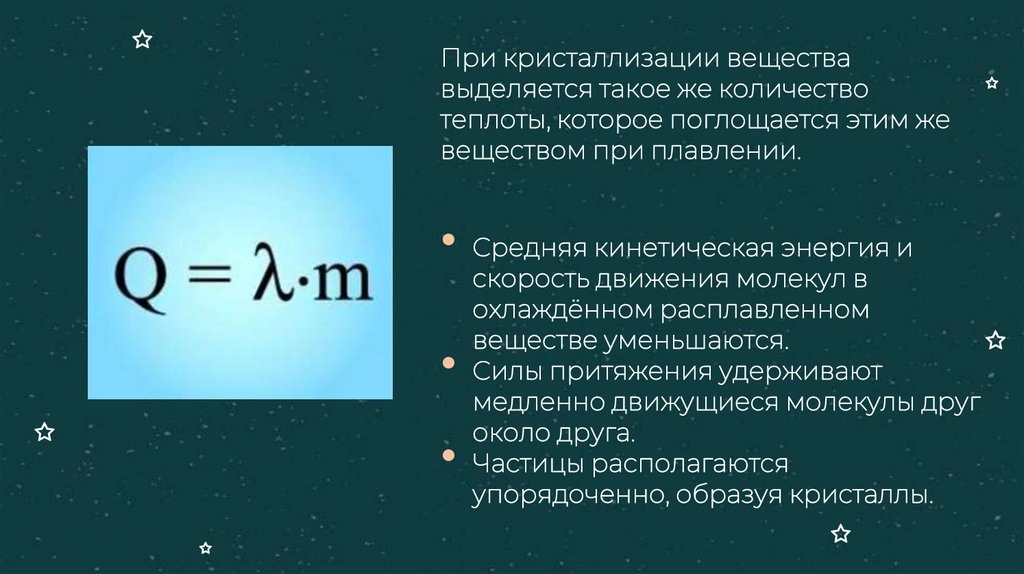 10. При кристаллизации вещества выделяется такое же количество теплоты, которое поглощается этим же веществом при плавлении.