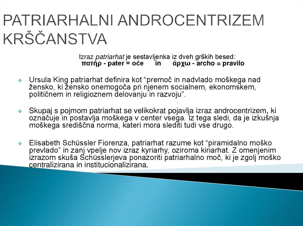 Ursula King patriarhat definira kot “premoč in nadvlado moškega nad