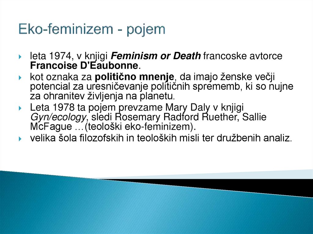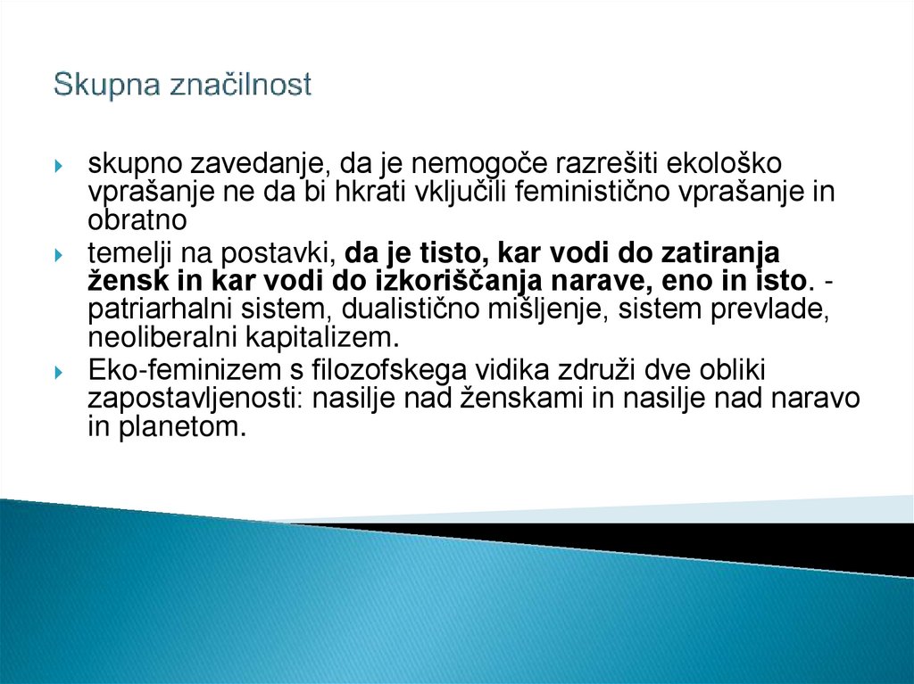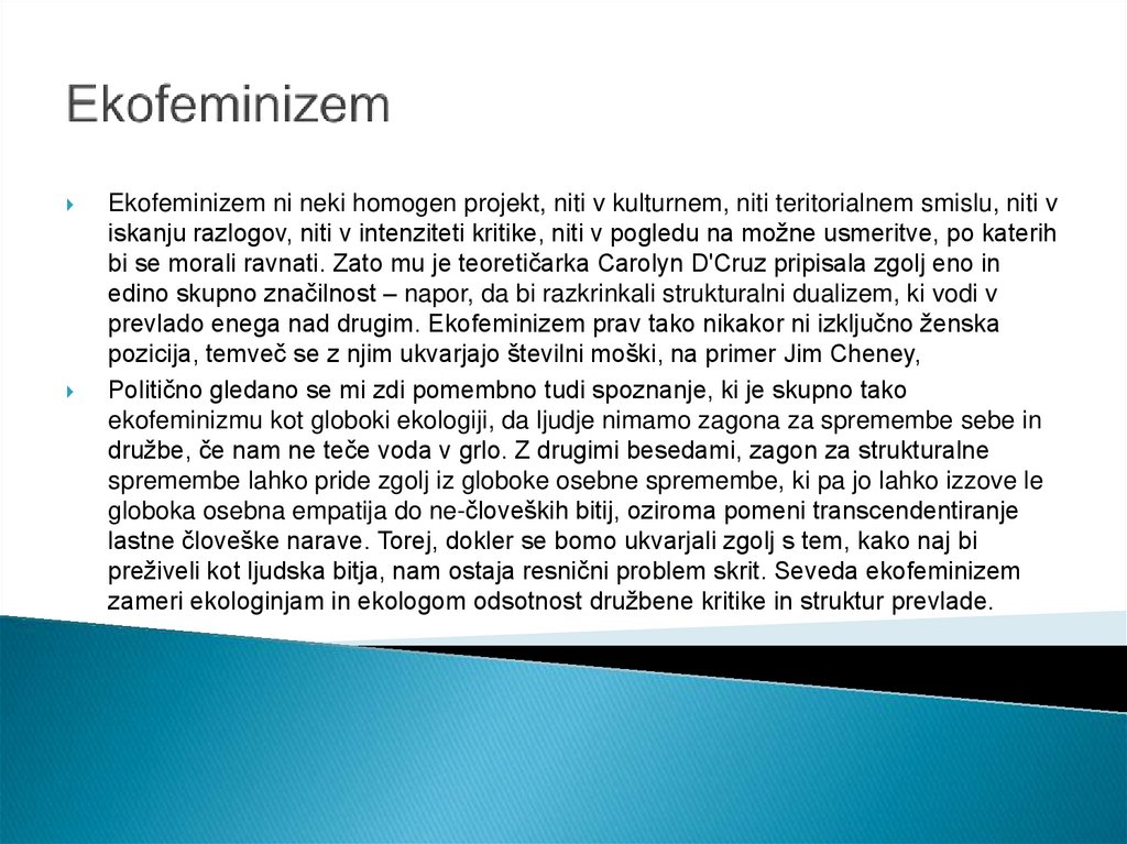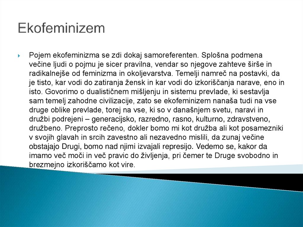 sam temelj zahodne civilizacije, zato se ekofeminizem nanaša tudi na vse