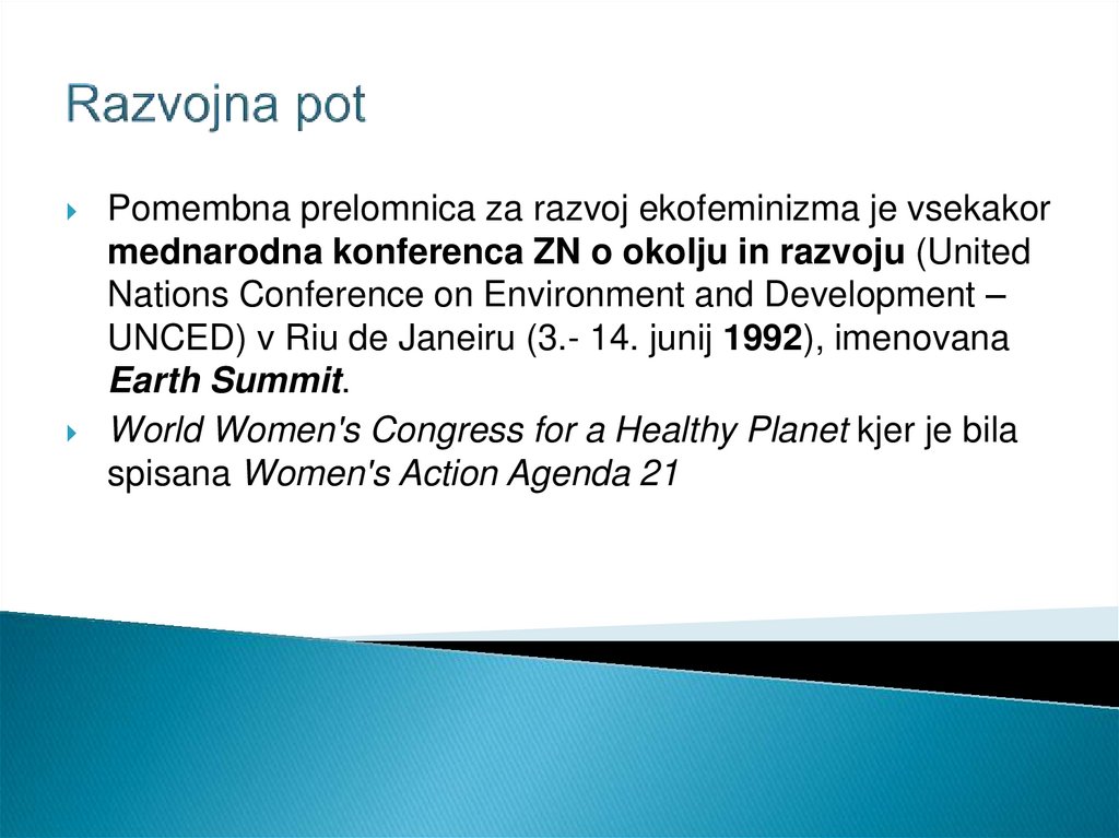 Pomembna prelomnica za razvoj ekofeminizma je vsekakormednarodna konferenca ZN o okolju in razvoju (United
