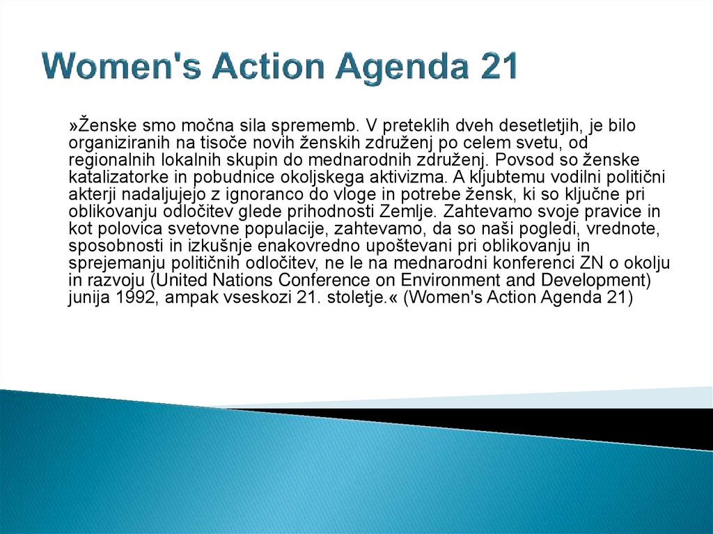 junija 1992, ampak vseskozi 21. stoletje.« (Women's Action Agenda 21)