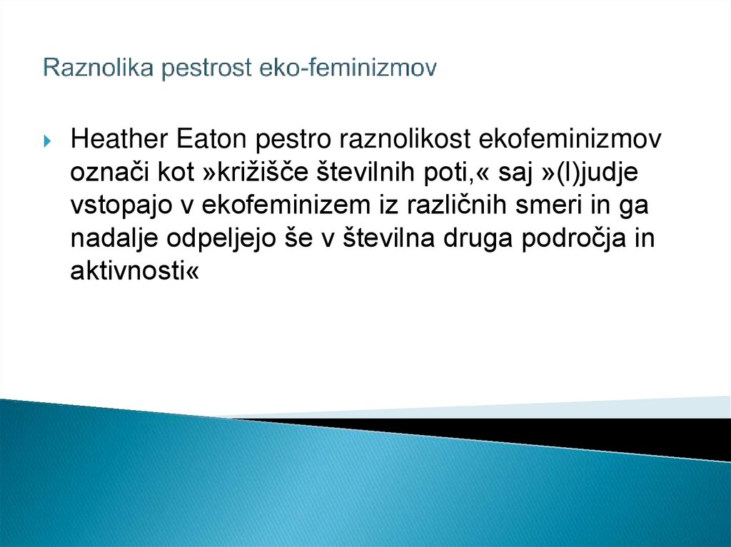 Heather Eaton pestro raznolikost ekofeminizmovoznači kot »križišče številnih poti,« saj »(l)judje