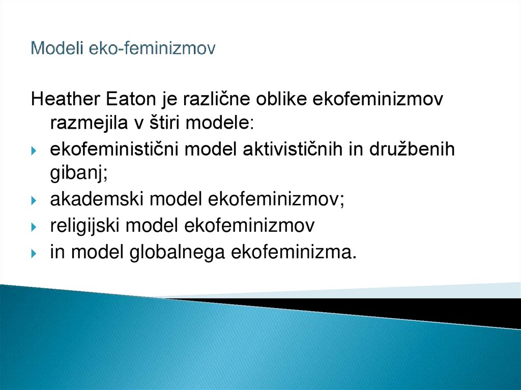 Heather Eaton je različne oblike ekofeminizmovrazmejila v štiri modele:
