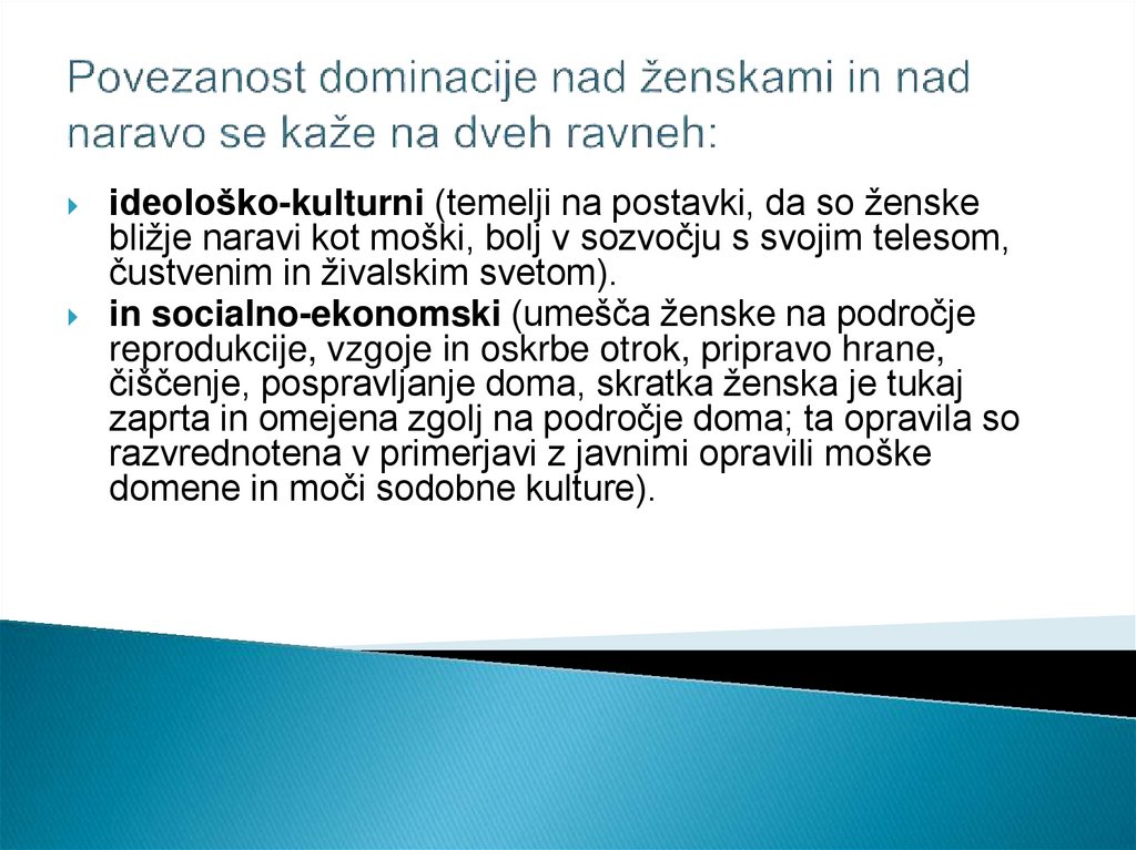 ideološko-kulturni (temelji na postavki, da so ženskebližje naravi kot moški, bolj v sozvočju s svojim telesom,