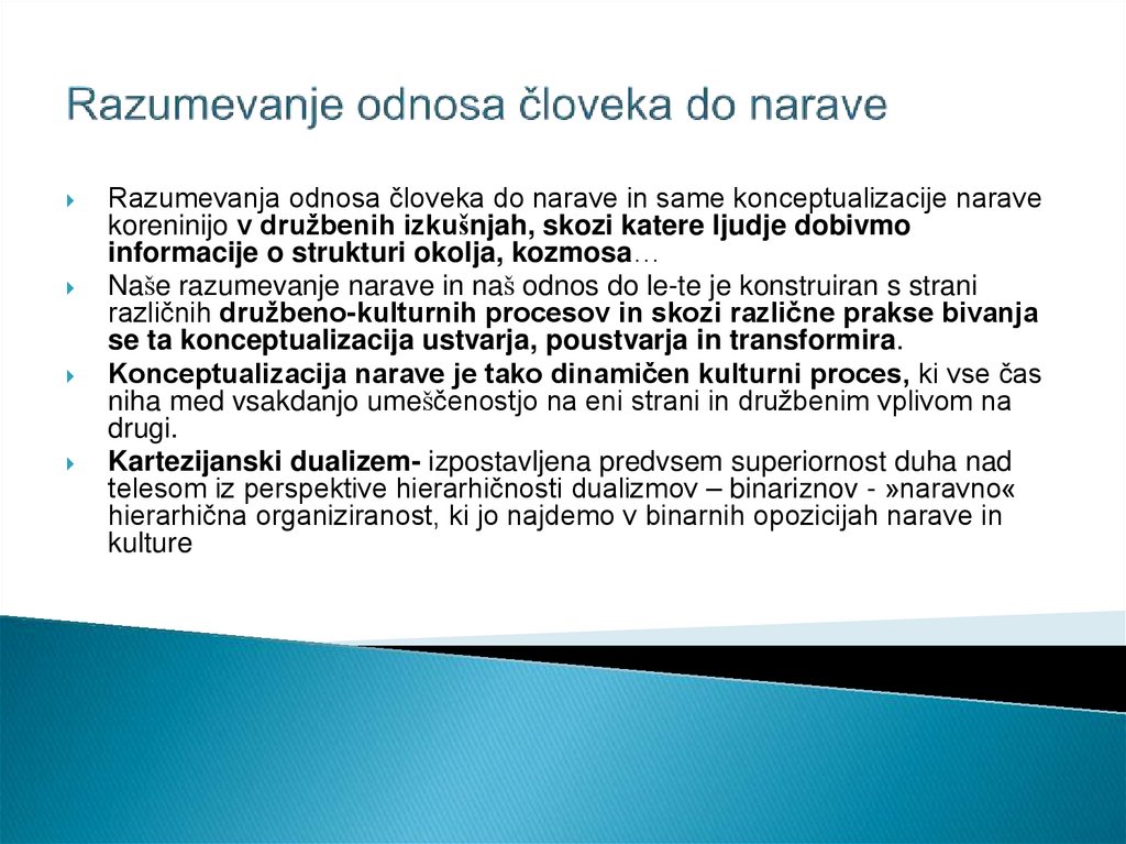 Razumevanja odnosa človeka do narave in same konceptualizacije naravekoreninijo v družbenih izkušnjah, skozi katere ljudje dobivmo