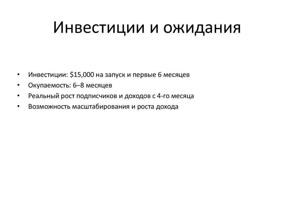 Инвестиции и ожиданияИнвестиции: $15,000 на запуск и первые 6 месяцев