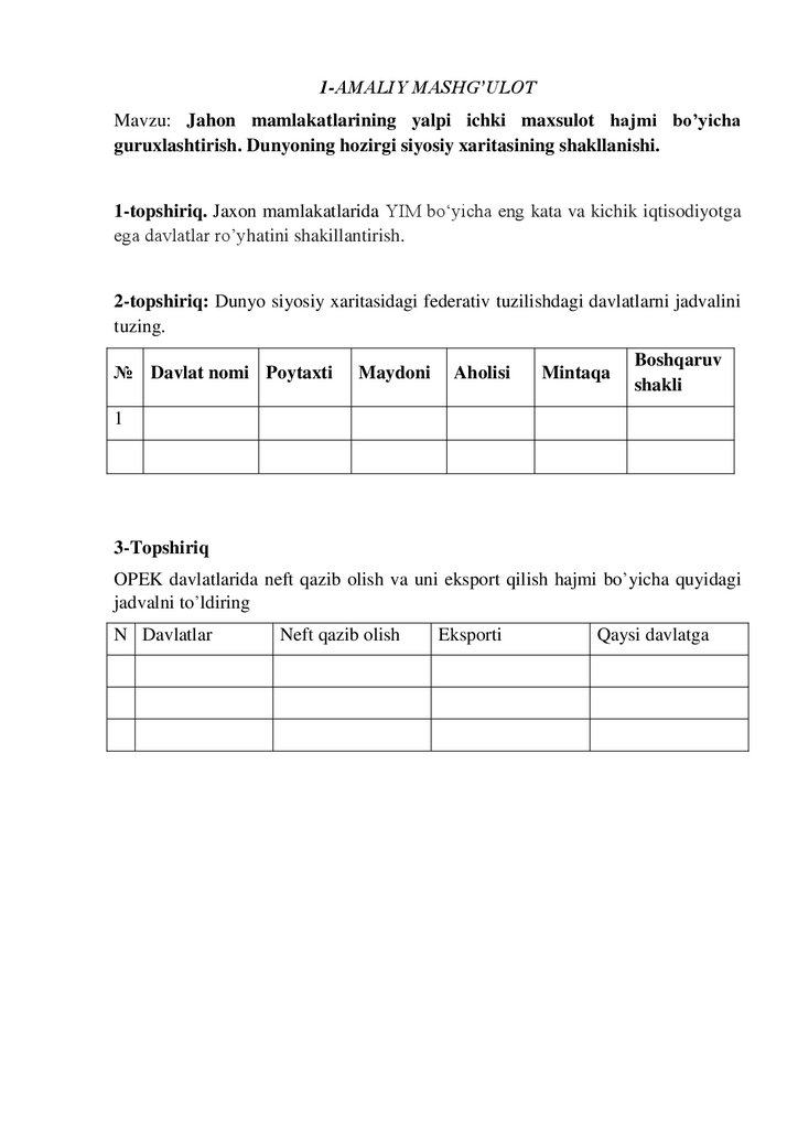 1-AMALIY MASHG’ULOTMavzu: Jahon mamlakatlarining yalpi ichki maxsulot hajmi bo’yicha