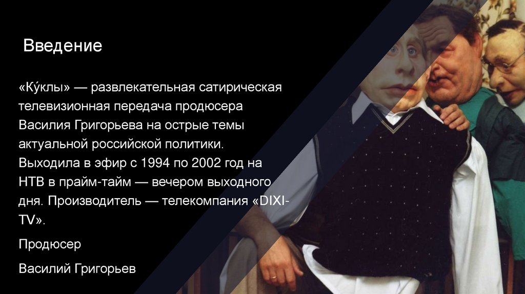 • Телевизионная программа «Куклы» на НТВ была созданапродюсером Василием Григорьевым в 1994 году. Изначально он