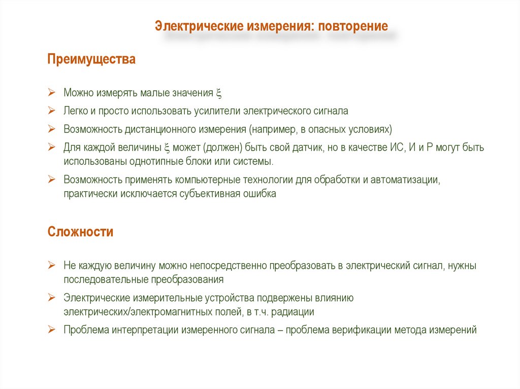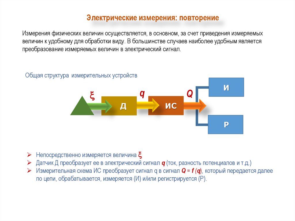Электрические измерения: повторениеИзмерения физических величин осуществляется, в основном, за счет приведения измеряемых