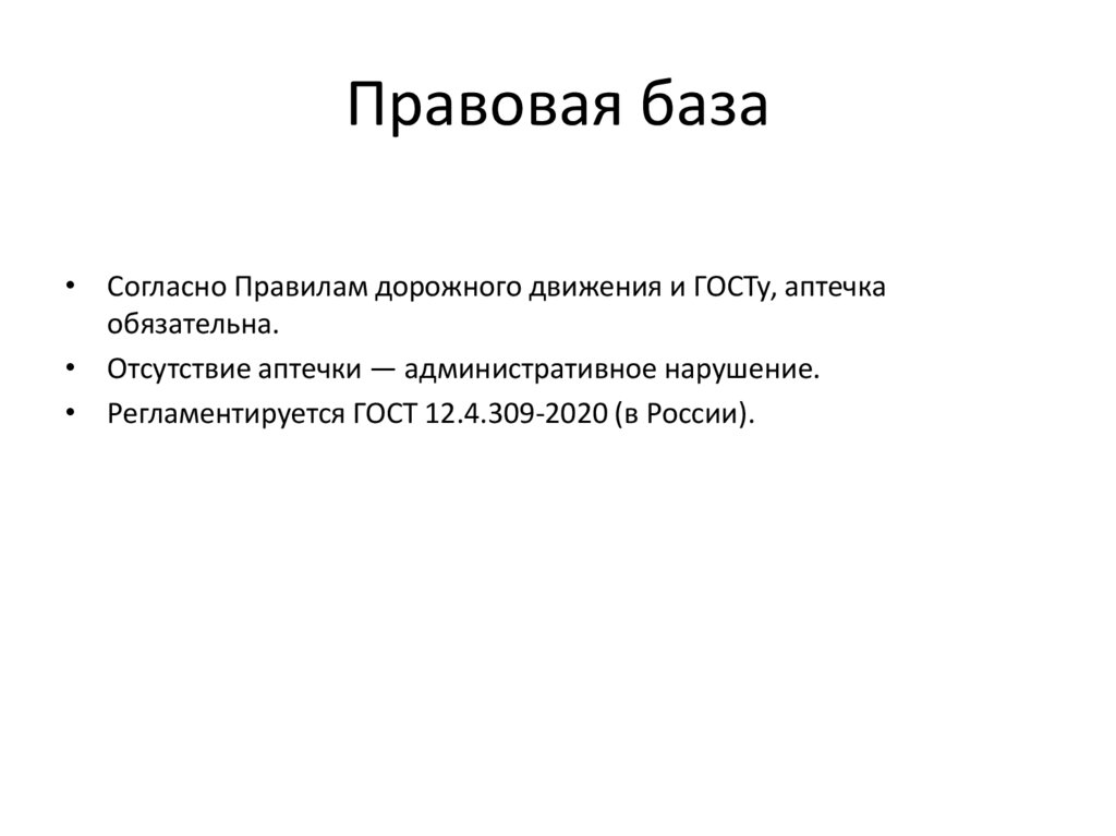 Правовая база• Согласно Правилам дорожного движения и ГОСТу, аптечка