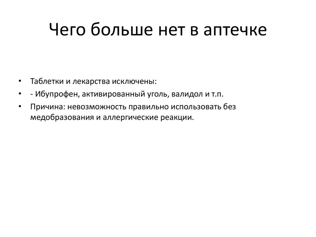 Чего больше нет в аптечке• Таблетки и лекарства исключены: