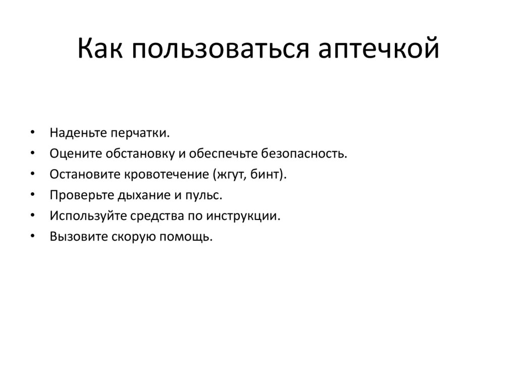 • Следите за сроками годности бинтов, антисептиков и перчаток.