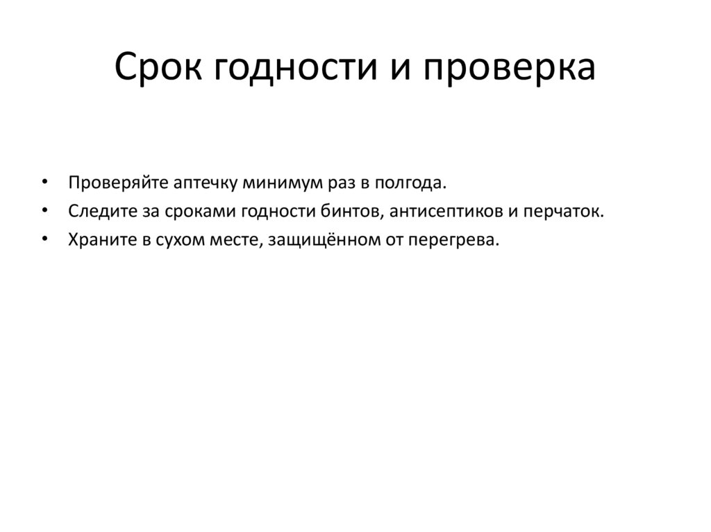 Срок годности и проверка• Проверяйте аптечку минимум раз в полгода.