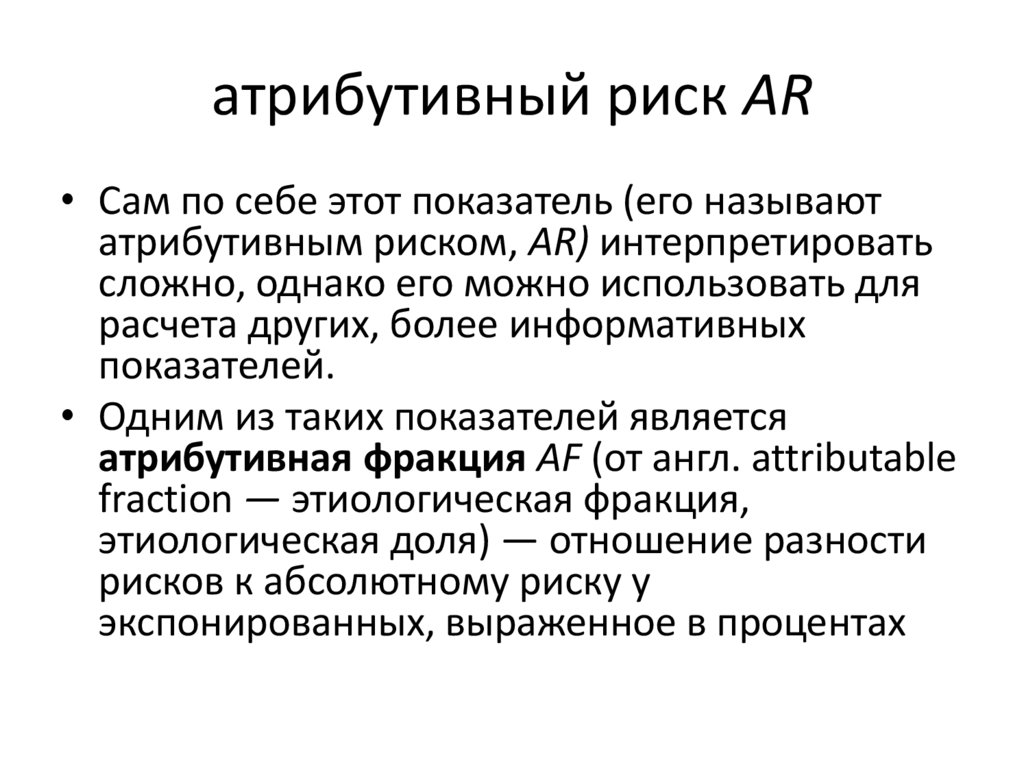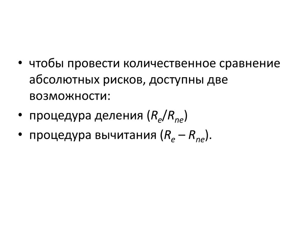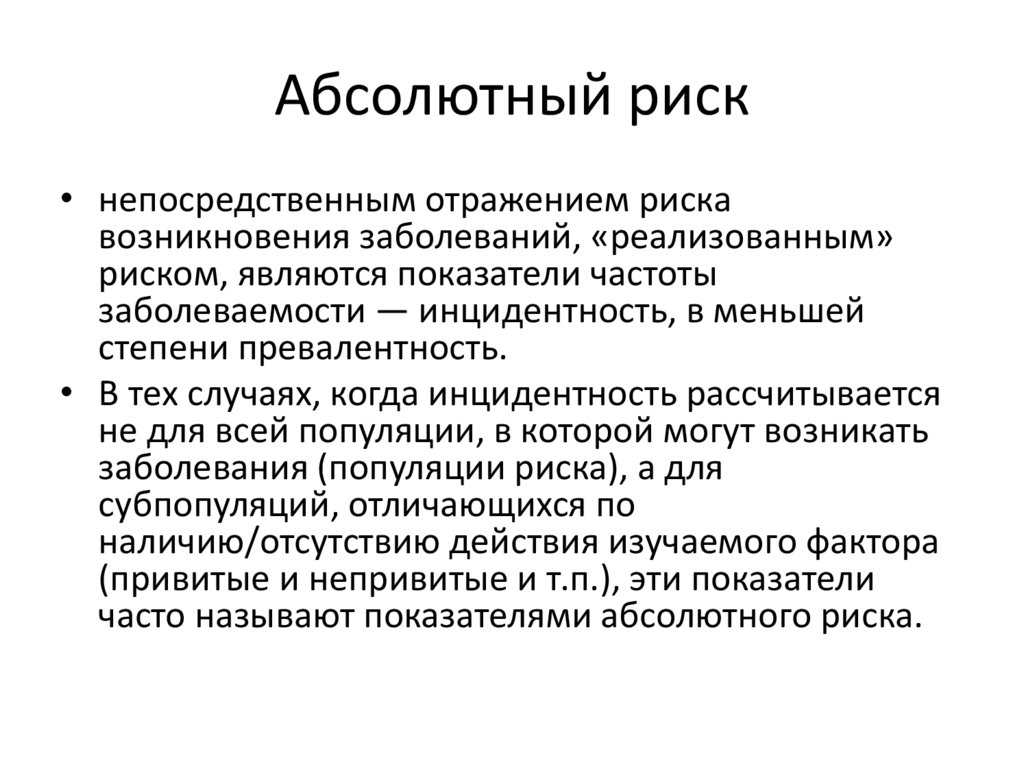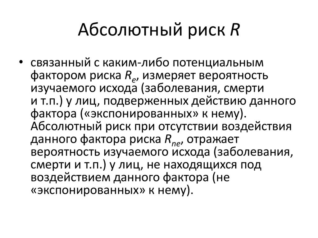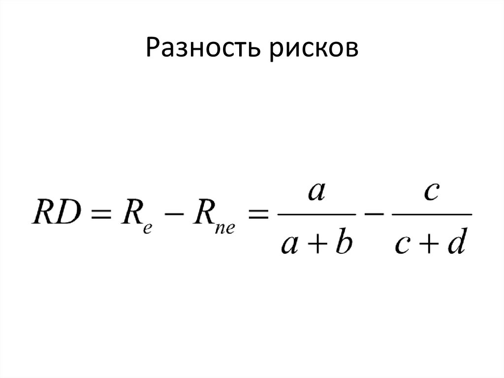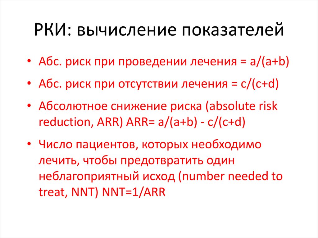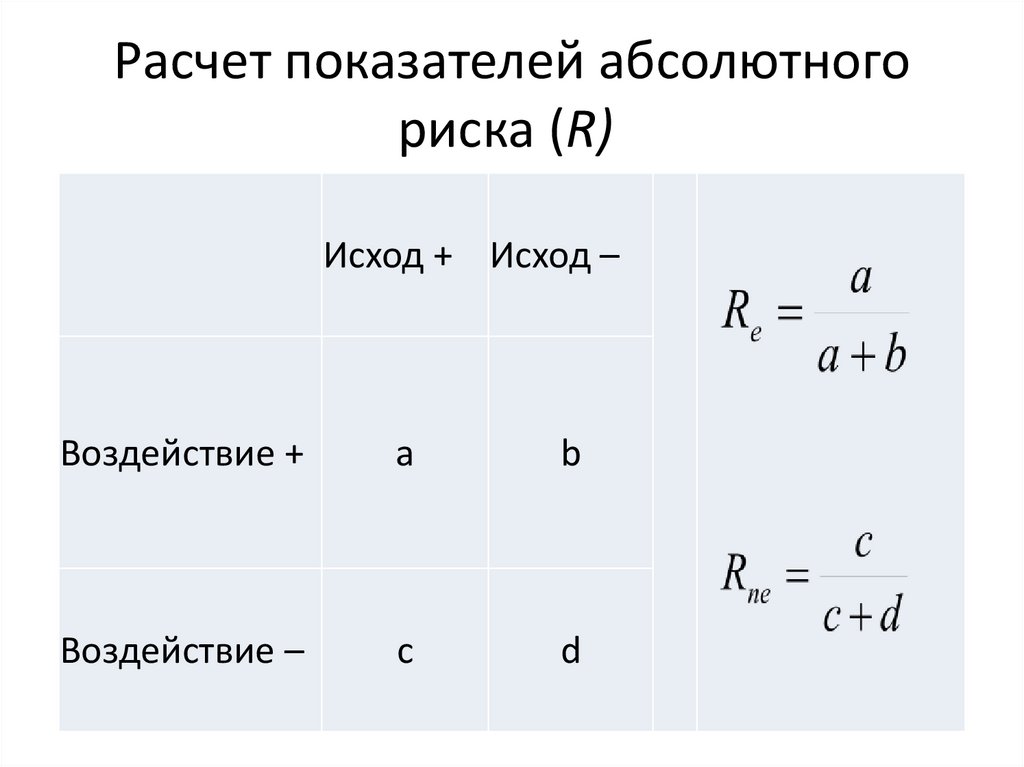 • Абс. риск при проведении лечения = a/(a+b)• Абс. риск при отсутствии лечения = c/(c+d)