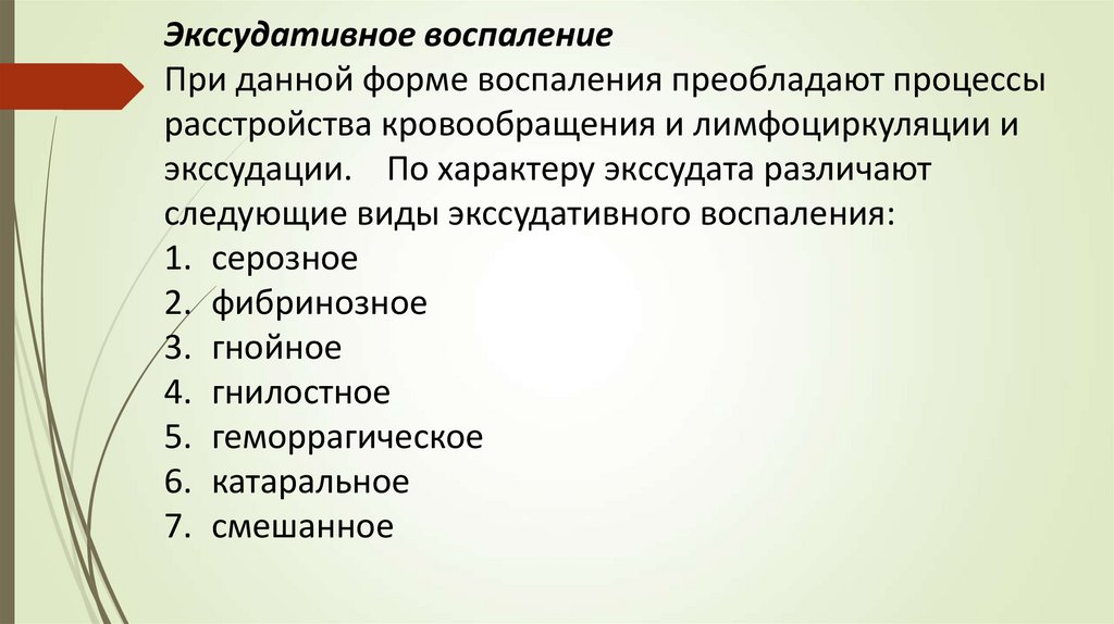 Экссудативное воспалениеПри данной форме воспаления преобладают процессы