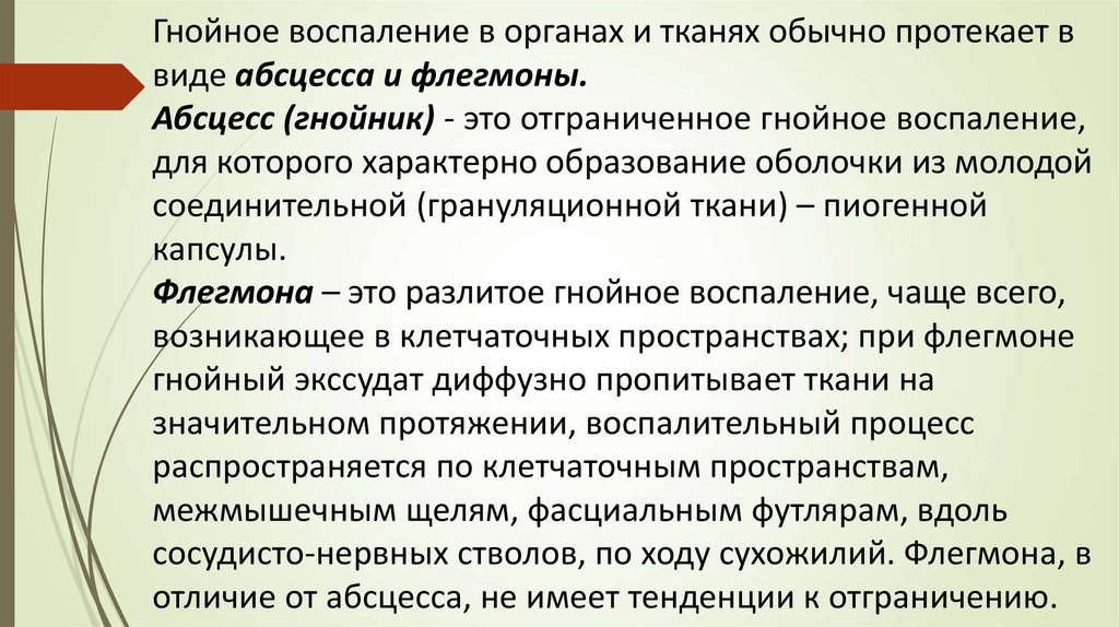 Гнойное воспаление в органах и тканях обычно протекает ввиде абсцесса и флегмоны.