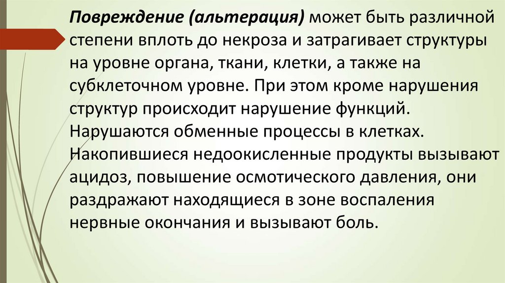 Повреждение (альтерация) может быть различнойстепени вплоть до некроза и затрагивает структуры