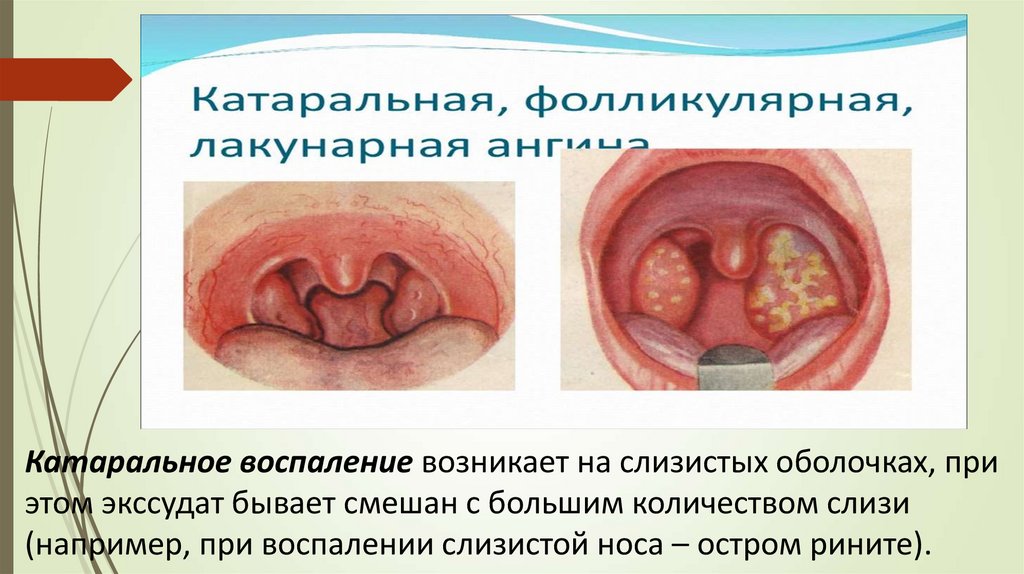 Катаральное воспаление возникает на слизистых оболочках, приэтом экссудат бывает смешан с большим количеством слизи