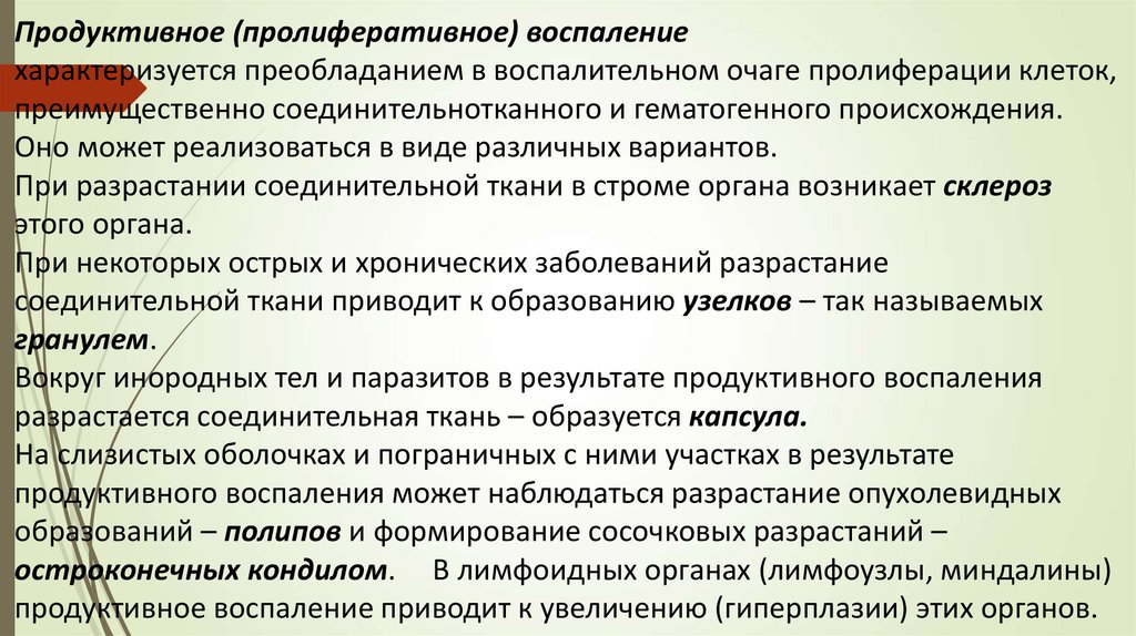 Продуктивное (пролиферативное) воспалениехарактеризуется преобладанием в воспалительном очаге пролиферации клеток,