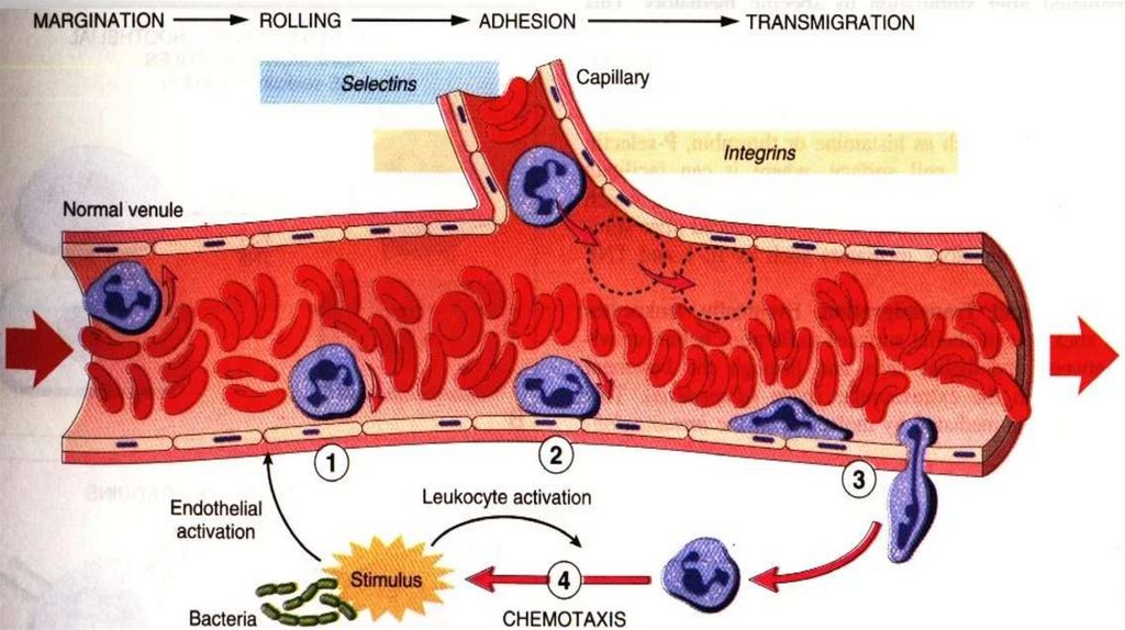 стенки (краевое стояние лейкоцитов), а затем выходят во