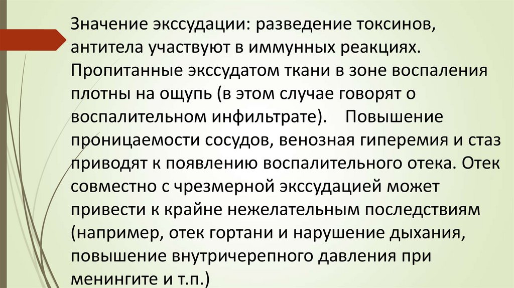 Значение экссудации: разведение токсинов,антитела участвуют в иммунных реакциях.