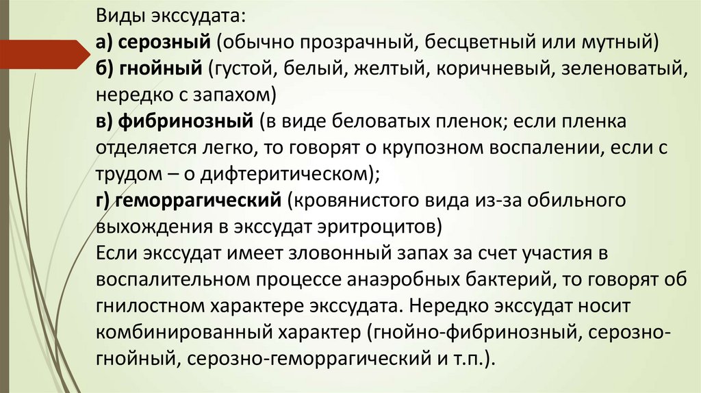 комбинированный характер (гнойно-фибринозный, серозногнойный, серозно-геморрагический и т.п.).