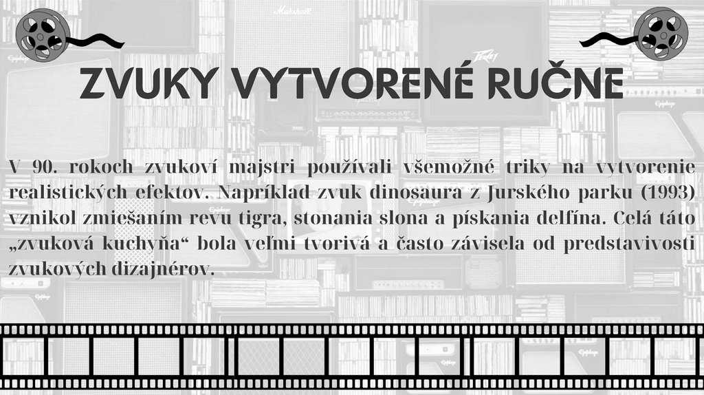 V 90. rokoch zvukoví majstri používali všemožné triky na vytvorenierealistických efektov. Napríklad zvuk dinosaura z Jurského parku (1993)