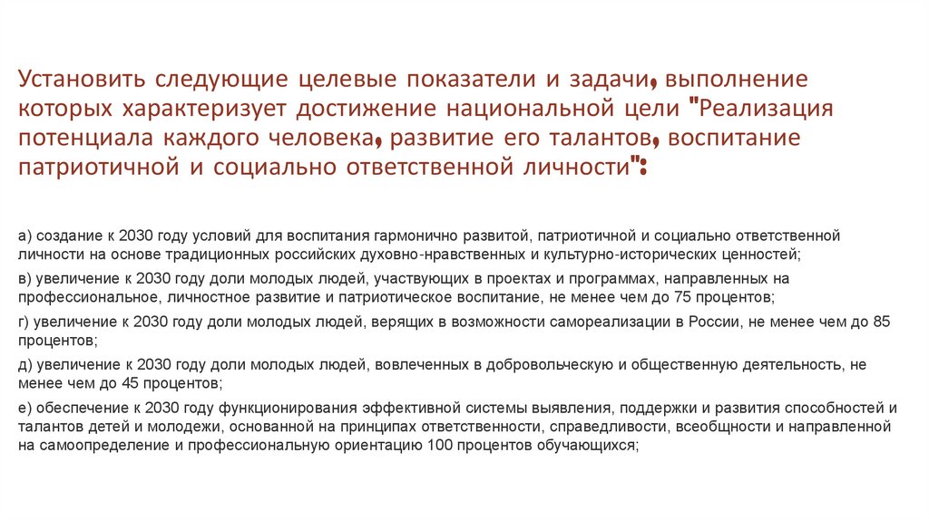 г) увеличение к 2030 году доли молодых людей, верящих в возможности самореализации в России, не менее чем до 85