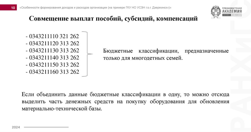 «Особенности формирования доходов и расходов организации (на примере ГКУ НО УСЗН г.о.г. Дзержинск»)»Совмещение выплат пособий, субсидий, компенсаций