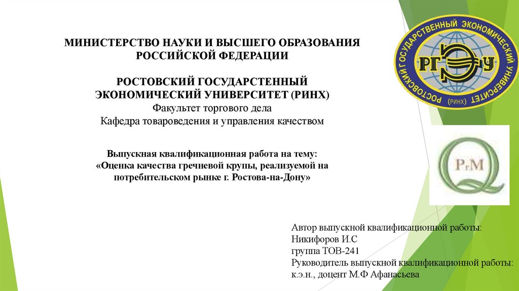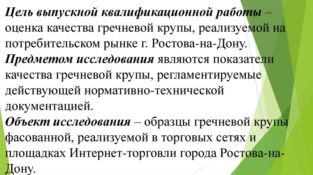 Цель выпускной квалификационной работы –оценка качества гречневой крупы, реализуемой на