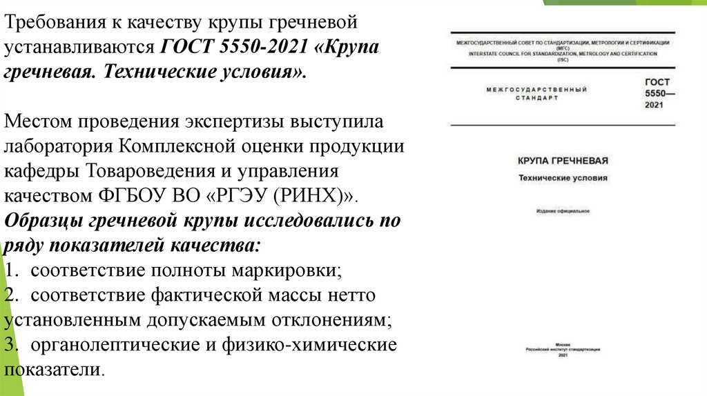 Требования к качеству крупы гречневойустанавливаются ГОСТ 5550-2021 «Крупа