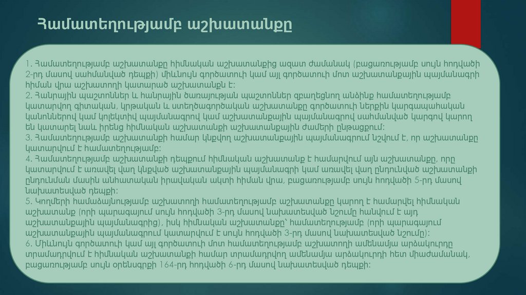 Համատեղությամբ աշխատանքը1. Համատեղությամբ աշխատանքը հիմնական աշխատանքից ազատ ժամանակ (բացառությամբ սույն հոդվածի
