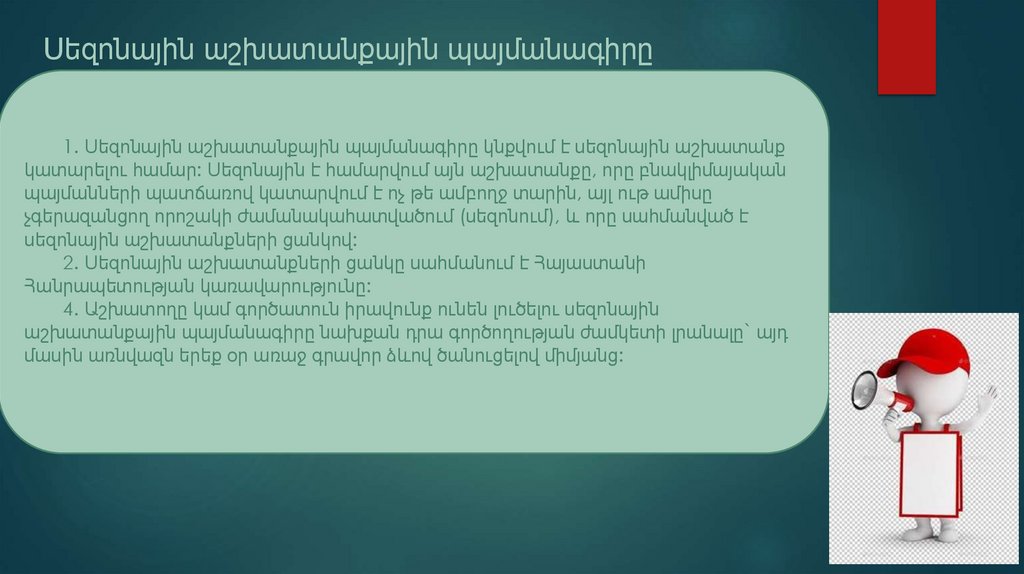 Սեզոնային աշխատանքային պայմանագիրը1. Սեզոնային աշխատանքային պայմանագիրը կնքվում է սեզոնային աշխատանք