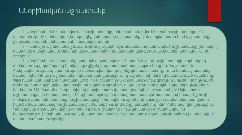 Անօրինական աշխատանք1. Անօրինական է համարվում այն աշխատանքը, որն իրականացվում է առանց աշխատանքային