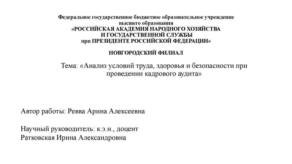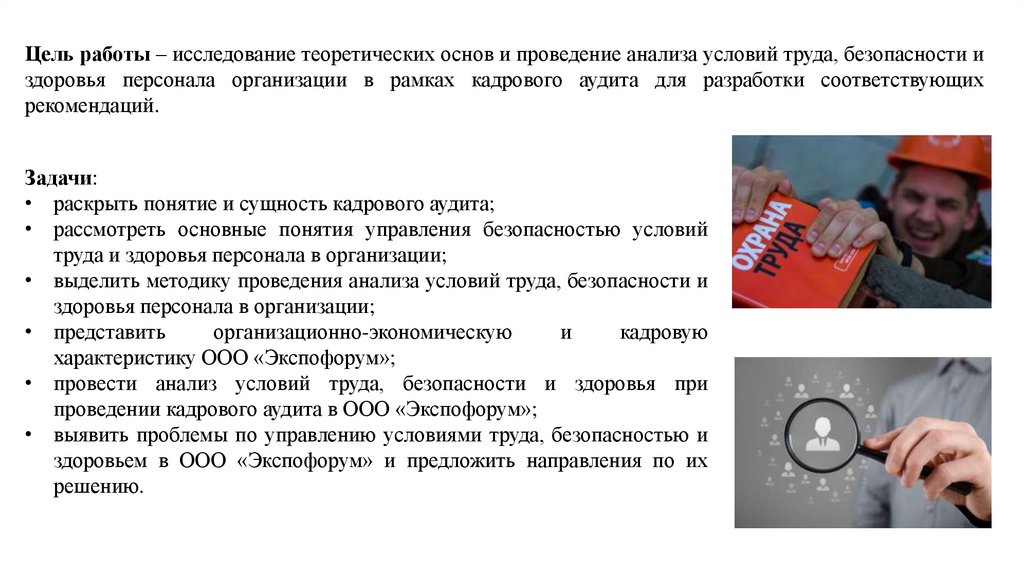 Цель работы – исследование теоретических основ и проведение анализа условий труда, безопасности издоровья персонала организации в рамках кадрового аудита для разработки соответствующих