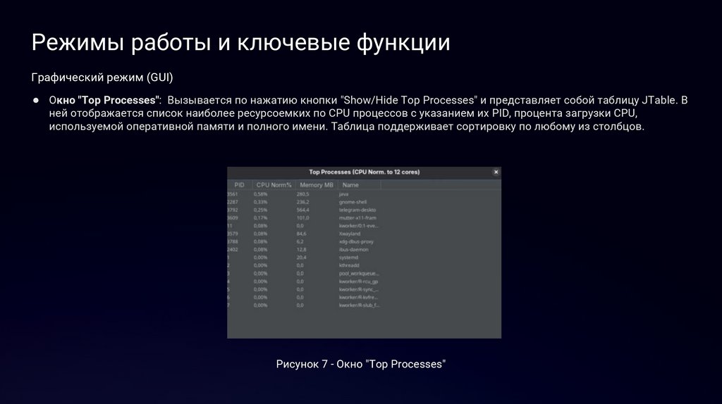 ● Окно "Top Processes": Вызывается по нажатию кнопки "Show/Hide Top Processes" и представляет собой таблицу JTable. В
