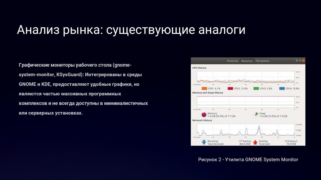 Анализ рынка: существующие аналогиГрафические мониторы рабочего стола (gnomesystem-monitor, KSysGuard): Интегрированы в среды