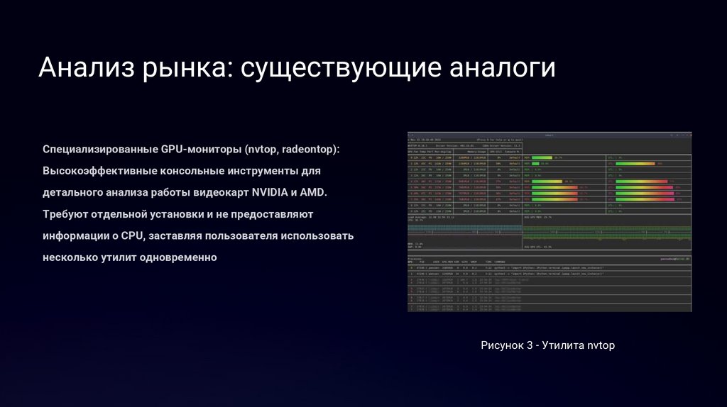 Анализ рынка: существующие аналогиСпециализированные GPU-мониторы (nvtop, radeontop):