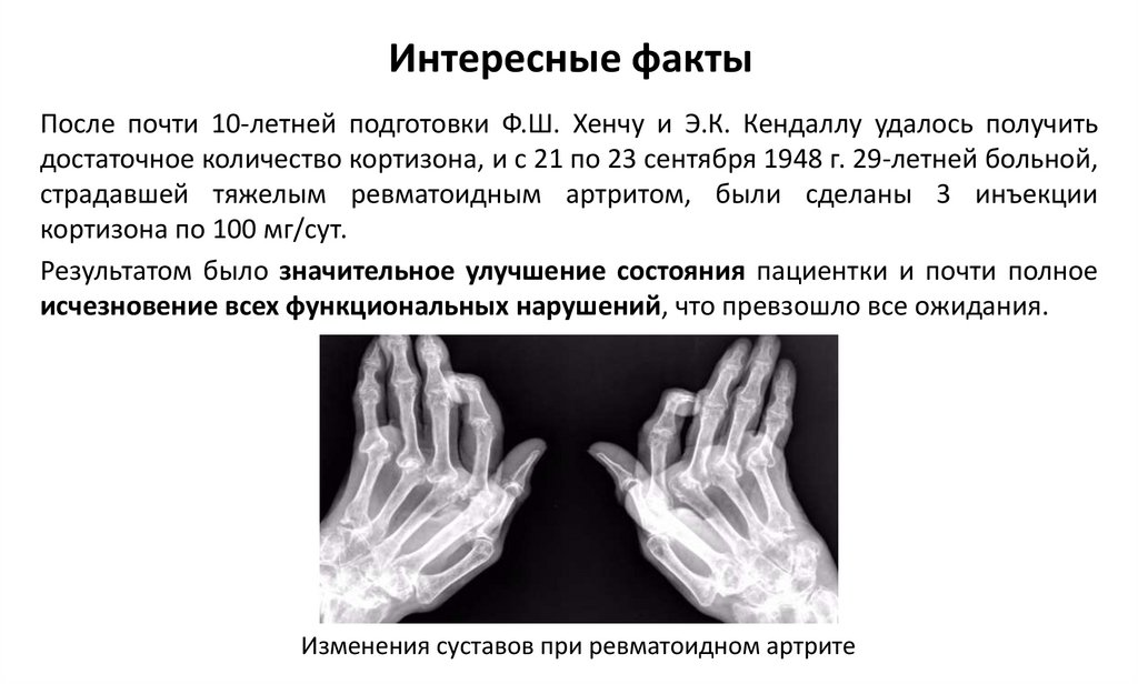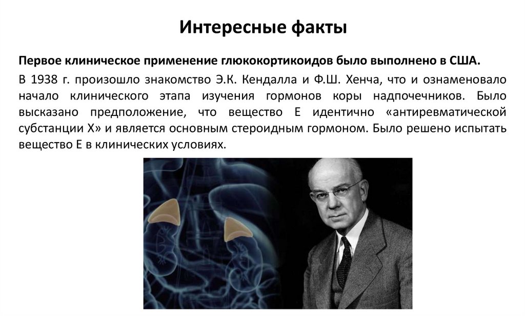 Интересные фактыПервое клиническое применение глюкокортикоидов было выполнено в США.