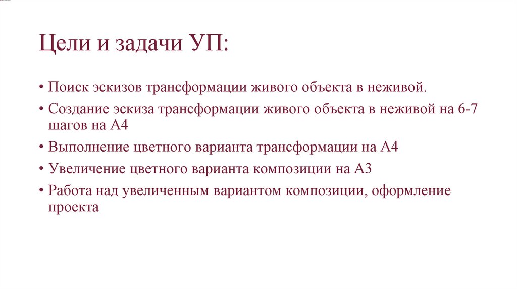 Цели и задачи УП:• Поиск эскизов трансформации живого объекта в неживой.
