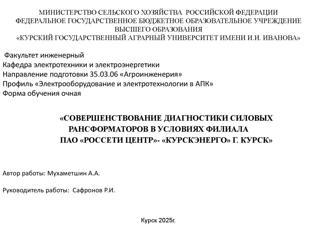 Совершенствование диагностики силовых трансформаторов в условиях филиала ПАО «Россети Центр» - «Курскэнерго», г. Курск