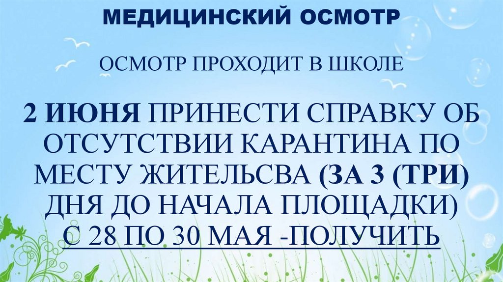 6. МЕДИЦИНСКИЙ ОСМОТР ОСМОТР ПРОХОДИТ В ШКОЛЕ 2 ИЮНЯ ПРИНЕСТИ СПРАВКУ ОБ ОТСУТСТВИИ КАРАНТИНА ПО МЕСТУ ЖИТЕЛЬСВА (ЗА 3 (ТРИ) ДНЯ