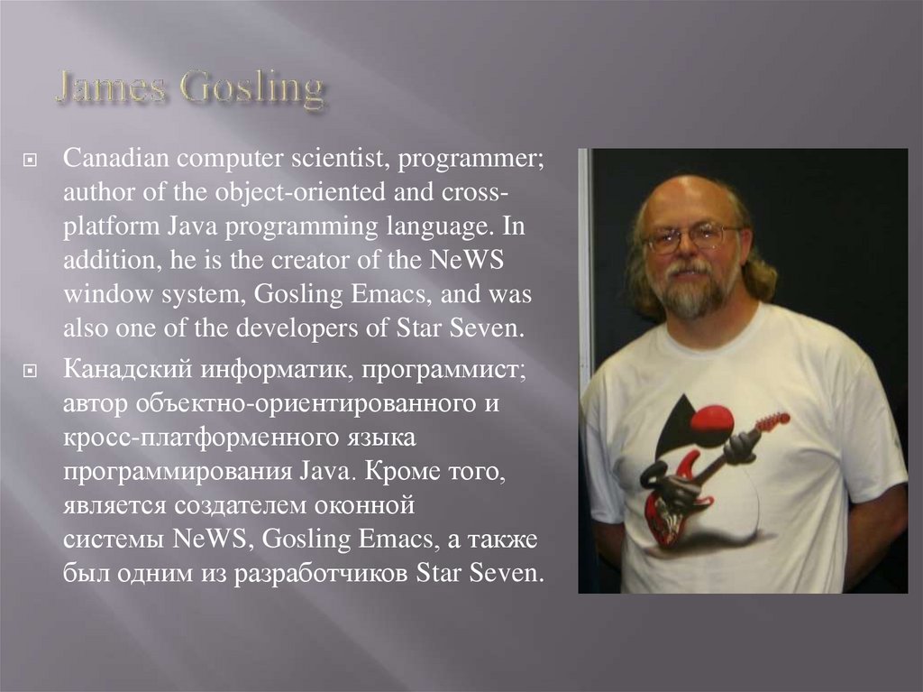 Canadian computer scientist, programmer;author of the object-oriented and crossplatform Java programming language. In