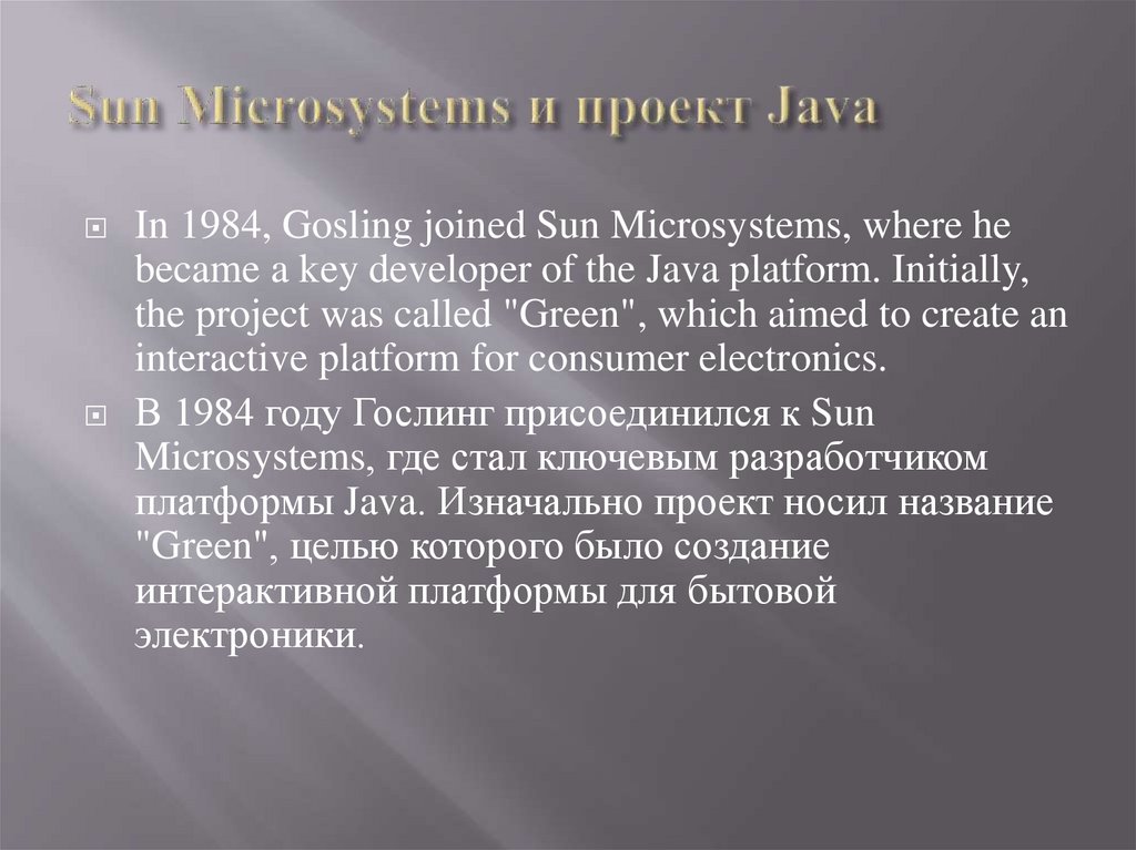 In 1984, Gosling joined Sun Microsystems, where hebecame a key developer of the Java platform. Initially,