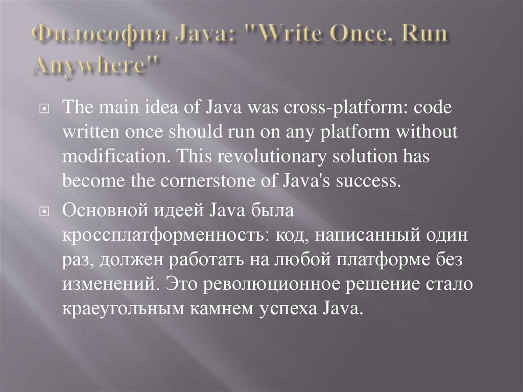 The main idea of Java was cross-platform: codewritten once should run on any platform without