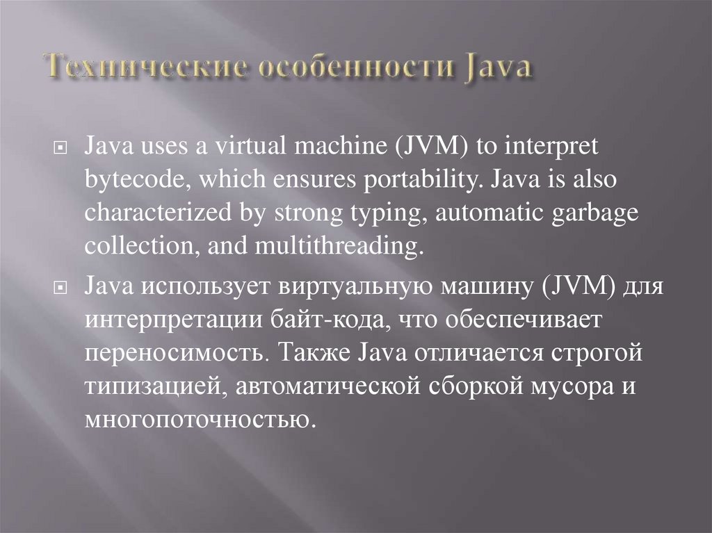 Java uses a virtual machine (JVM) to interpretbytecode, which ensures portability. Java is also